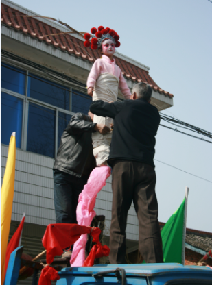 高臺芯子分三層,最高一層叫“上裝”,中間一層叫“中裝”,固定在桌子上的一層叫“下裝”。矮芯子一般高不過兩層,仍在桌面造型表演,用人抬或用拖拉機、小四輪拉,比較靈便。因其比高臺芯子低,故稱矮芯子或“靠背子”。在排練過程中,首先,由鐵匠根據(jù)“出手”(把式)策劃設(shè)計戲文及打制人物所需的鐵芯和腳踏,再套上角色要穿的一只假腿、一只鞋。其次,表演的兒童雙腳并攏站在小踏板上,穿上預(yù)先套上的一條褲腿(褲腿下面即是假腿假腳);另一只空褲腿套一只假腿假腳,彎曲所需姿態(tài)。再次,根據(jù)節(jié)目內(nèi)容穿上所扮演角色的成人服裝。最后,根據(jù)戲文演繹故事,演唱戲曲。