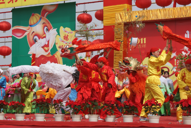 玩板凳龍時,用鑼鼓伴奏,氣氛更加熱烈。舞龍節(jié)奏緊湊,動作激烈,高難度動作有“跑圓場”“左右擺”“龍翻身”等。其中“龍翻身”表演難度最大。舞龍的三個人舉起板凳翻身掏花,耍頭的兩人將板凳舉起后從凳下鉆過,耍尾的一人緊接著換手翻身,也從凳下鉆過,因而,“龍翻身”又稱為“老龍打滾”。表演至高潮時往往連續(xù)翻轉無數次,接著以五龍捧圣收場。