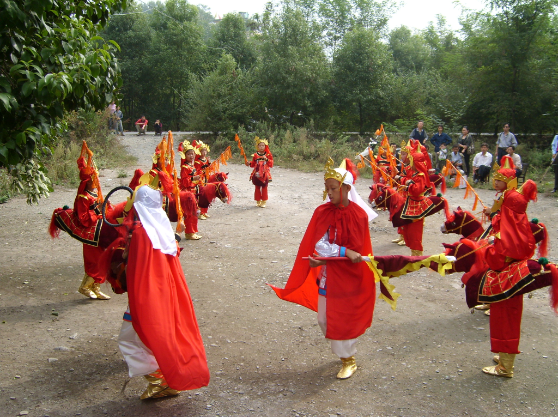 曉道竹馬是流傳于嵐皋縣曉道鄉(xiāng)的一項(xiàng)在春節(jié)期間開展的民俗演藝活動(dòng)。此項(xiàng)活動(dòng)的道具是竹馬,用竹子編成兩個(gè)直徑0.5米的框子,安上馬頭和馬尾,糊上皮紙;再用紙貼上馬毛,用繩子將馬頭、馬尾固定在兒童身上。