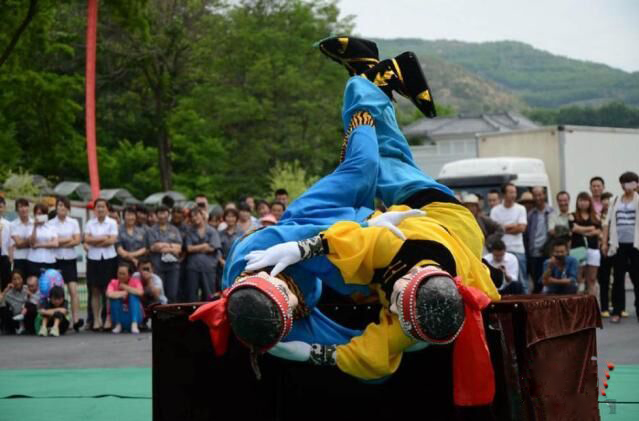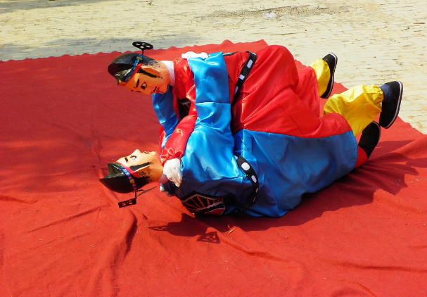 旬陽摔跤看似二人摔跤,實為一人表演。表演者穿戴上巧妙的道具,扮演兩個扎小辮的頑皮兒童扭打摔跤。演出道具是一對半截假人,其上身骨架為木質(zhì),頭戴假面具,外罩藍布或青衣大褂,假人兩面相對,兩臂相搭連,做摔跤狀;其雙腳穿上假人的套褲與靴子,附身將雙手穿上另一個假人的褲子和靴子,用長衫蓋住頭部,兩人相互使絆,用掄、轉(zhuǎn)、滾、翻、摔、掃、踢、擋、下絆、托舉等技巧動作,配以鑼鼓打擊樂,呈現(xiàn)兩人摔跤的場景。整個表演惟妙惟肖,難辨真假,生動有趣,滑稽幽默。
