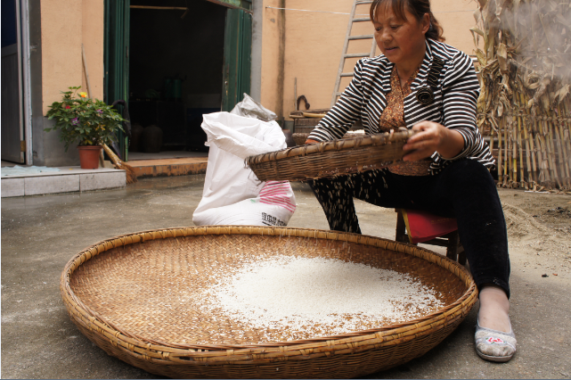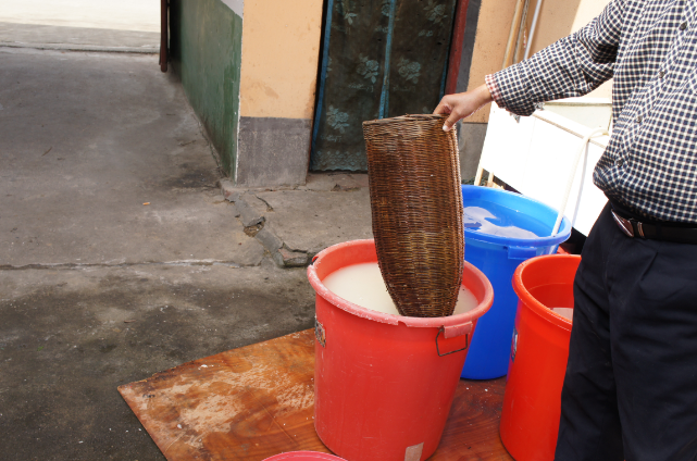 做稠酒的原料有糯米、水、酒曲,均產(chǎn)自當(dāng)?shù)亍J紫龋瑢⑴疵渍羰欤谀九杌蚱鸦@中攤開(kāi)、晾涼,加入適量甜酒曲拌勻,裝缸發(fā)酵13天,制成甜酒。然后,在制成的甜酒中加入適量小曲和涼開(kāi)水,攪拌均勻。再次,發(fā)酵。前幾天每天攪動(dòng)發(fā)酵物12次,待浮起來(lái)的糯米大部分沉下缸底后不再攪動(dòng),15天左右酒熟。