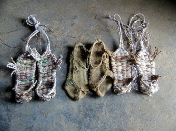 其制作過程如下:選取當?shù)爻赡贶诼椋蔚敉馄ぃ栏蓚溆茫ㄒ灿杏米亟z、龍須草、構(gòu)樹皮、稻草、舊布條);搓好繩子,掛到草鞋耙子上編織;編織成鞋的樣子,再上好鞋耳子,穿好左右兩只即可穿用。
