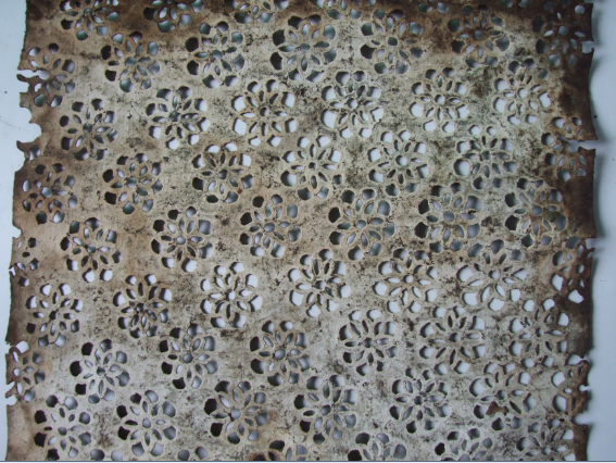制作藍(lán)印花布的工藝流程很復(fù)雜。首先從蓼藍(lán)草中提取藍(lán)作染料(靛藍(lán)),把鏤空花版鋪在白布上,用刮漿板把防染漿劑刮入花紋空隙漏印在布面上,干后放入染缸,將布放入缸中浸染20分鐘,而后取出氧化、透風(fēng)30分鐘,一般經(jīng)過6至8次反復(fù)染色,直到達(dá)到所需顏色為止。再將其拿出,放在空氣中氧化,晾干后刮去防染漿粉,即顯現(xiàn)出藍(lán)白花紋。因?yàn)槭侨止び∪荆珊蟮臐{不免會有裂紋,形成手工藍(lán)印花布特有的魅力——冰裂紋。