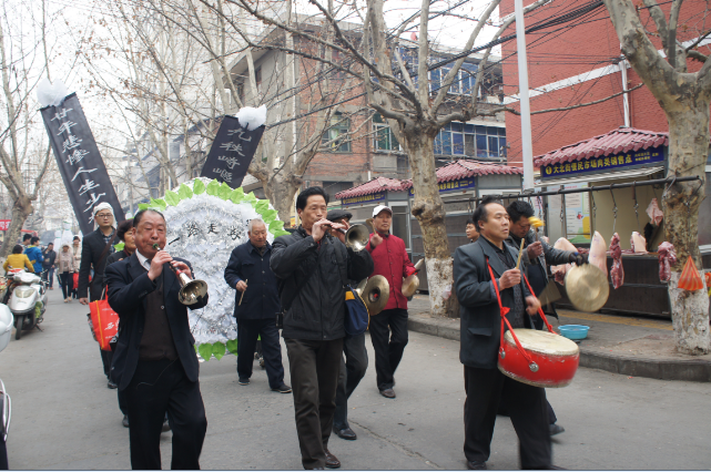 開吊日,需備宴請(qǐng)客,設(shè)樂隊(duì)。有錢人會(huì)在開吊日請(qǐng)禮賓,行葬禮,誦經(jīng)念佛,超度亡魂。有親友前來吊唁時(shí),孝子于靈旁跪哭,給吊者還禮。吊喪者送奠儀有火紙、幛幔、貢仙等。前來吊唁守夜的親朋夜間圍坐,打喪鼓,唱孝歌,直至天明。夜半將棺材升起墊高,以備天明出殯,叫“升靈”。