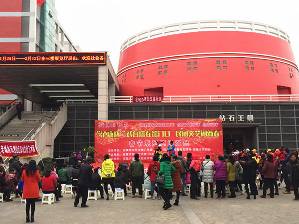 2017年2月6日,農(nóng)歷丁酉年正月初十,在安康市群眾藝術(shù)館內(nèi),隨著漢水文化藝術(shù)團(tuán)的演出拉開了一年一度由安康市文化文物廣電局、安康市文明辦、安康市創(chuàng)文辦和安康市雙創(chuàng)辦主辦,安康市群眾藝術(shù)館和漢濱區(qū)文化館承辦的“戲臺(tái)搭在館門口?民間文藝鬧新春”春節(jié)活動(dòng)的帷幕,廣場(chǎng)舞、歌伴舞等社團(tuán)自編自演的精彩節(jié)目,吸引了眾多觀眾前往觀看。
