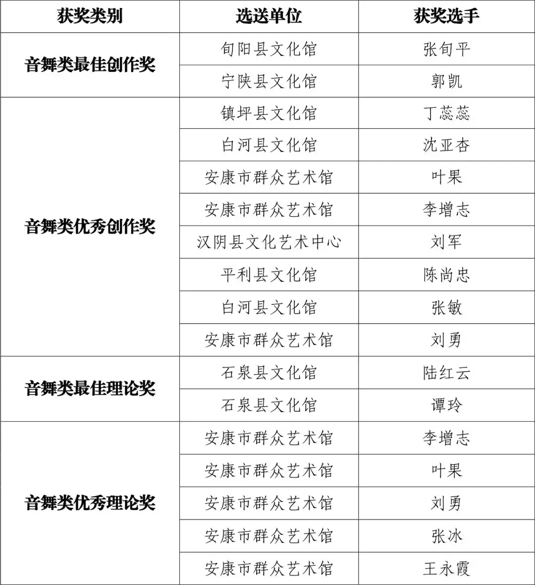 現(xiàn)將群星風(fēng)采·第六屆陜西省群文系統(tǒng)業(yè)務(wù)干部技能大賽安康選拔賽(音舞類)比賽結(jié)果公布如下: