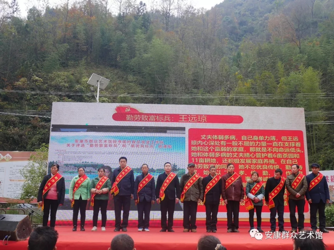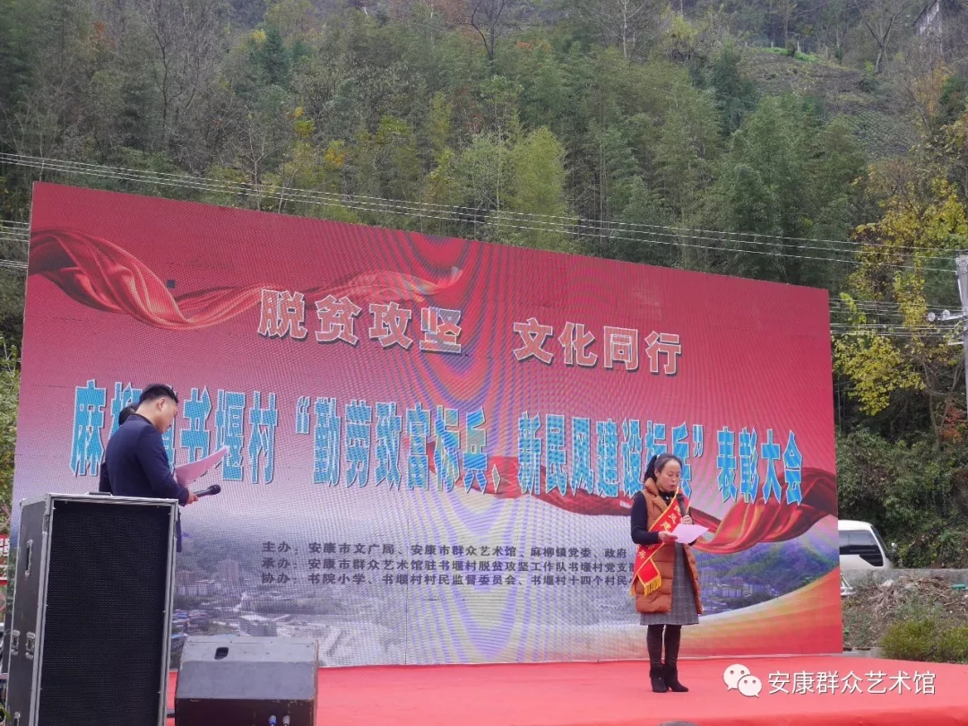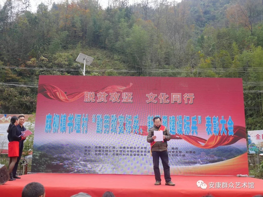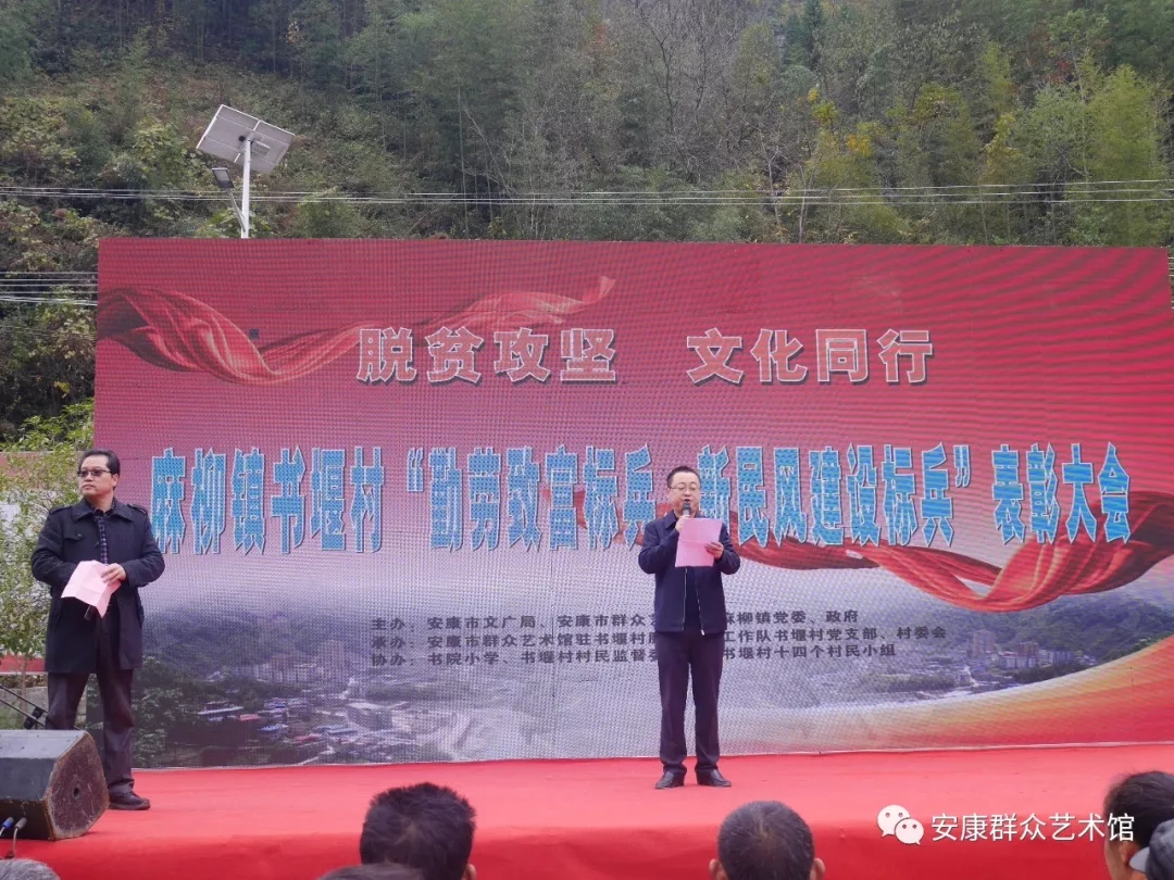 勤勞致富,脫貧攻堅奔小康。弘揚新風(fēng),凝聚振興新力量。在脫貧攻堅進入決戰(zhàn)之際,11月19日,由安康市文廣局、安康市群眾藝術(shù)館、麻柳鎮(zhèn)黨委、政府主辦,安康市群眾藝術(shù)館駐書堰村脫貧攻堅工作隊、書堰村黨支部、村委會承辦,書院小學(xué)、書堰村村民監(jiān)督委員會、書堰村十四個村民小組協(xié)辦的“勤勞致富標(biāo)兵、新民風(fēng)建設(shè)標(biāo)兵”表彰大會在紫陽縣麻柳鎮(zhèn)書堰村隆重舉行。