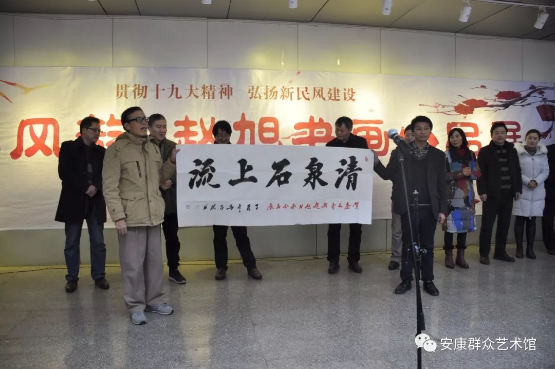 為貫徹黨的十九大精神,弘揚(yáng)新民風(fēng)建設(shè),深入學(xué)習(xí)習(xí)近平新時(shí)代中國特色社會主義思想“堅(jiān)定文化自信,推動社會主義文化繁榮興盛”的偉大號召,1月16日,由安康市群眾藝術(shù)館、石泉縣文廣旅游局和石泉縣文化館主辦的“秦巴風(fēng)韻·趙旭書畫小品展”在安康市群藝館展出。安康市文廣局副局長王軍、安康市群藝館館長周墻、安康市美協(xié)主席李健平、安康市書法家協(xié)會主席馬昌琪、石泉縣委宣傳部副部長胡書勇等領(lǐng)導(dǎo)出席了開展儀式,在開展儀式上,安康市書協(xié)主席馬昌琪為書畫展饋贈“清泉石上流”墨寶。